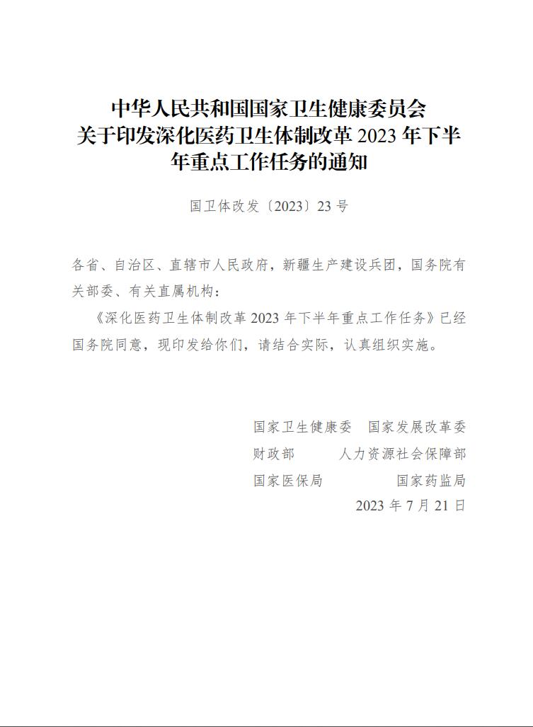 关于印发深化医药卫生体制改革 2023 年下半 年重点工作任务的通知
